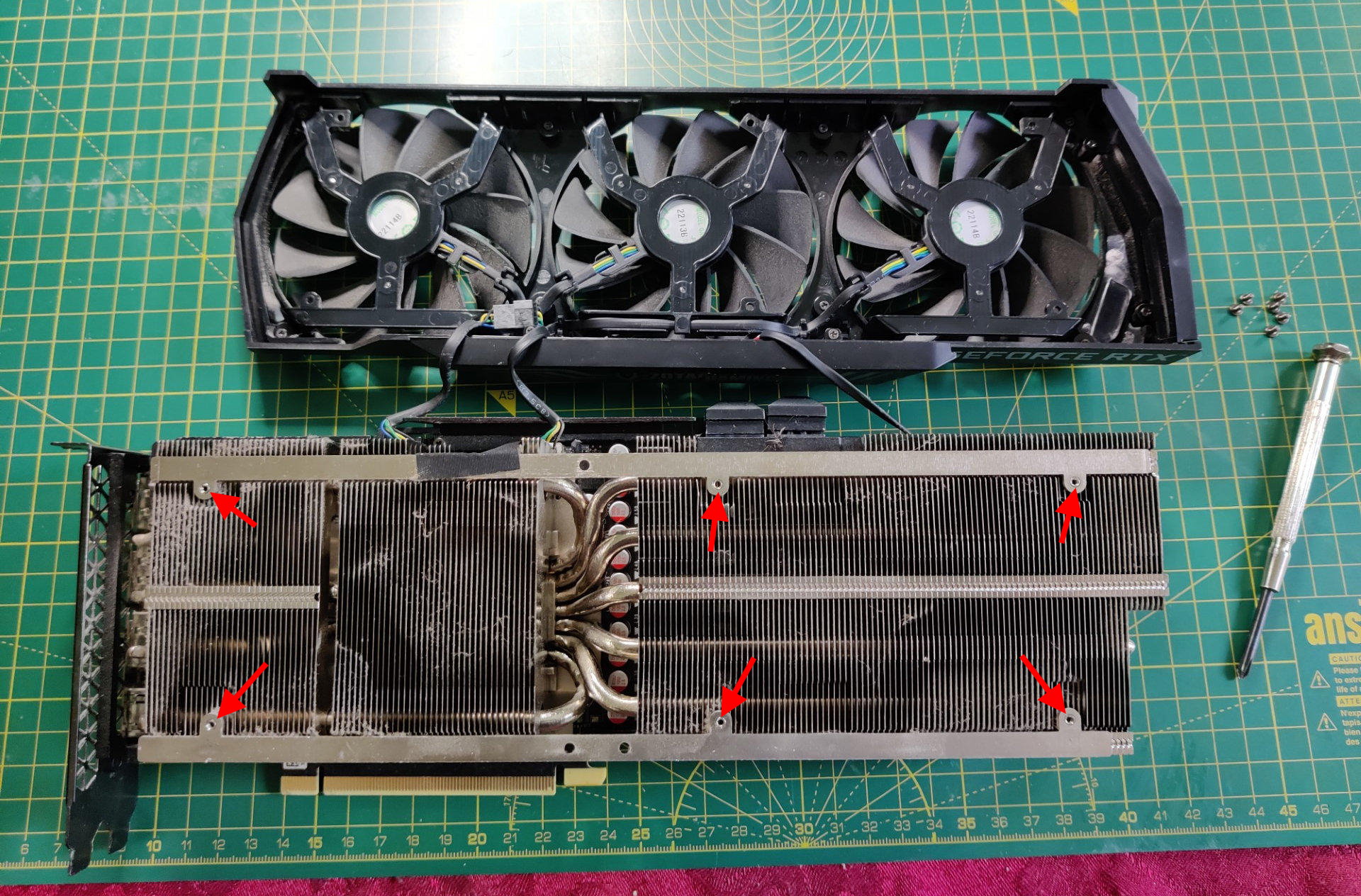 Changing the fans themselves turns out to be easy enough; the stock cooler comes off as a single unit. You just need to remove the 6 screws indicated by the red arrows in the following pic, which you access from between the blades of the fans. Don’t do what I did and undo every screw you see, as the other ones attach the fans to the shroud, and you do not need to undo those.