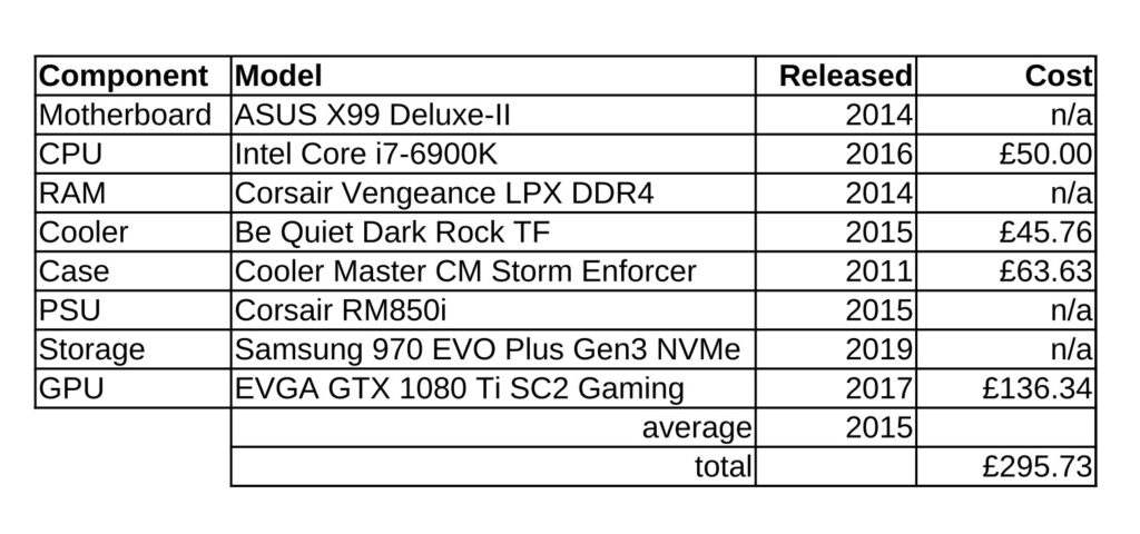 The system was an ASUS X99 Deluxe-II motherboard, an Intel Core i7-6900K CPU, and Corsair Vengeance LPX DDR4 RAM. Quite old by today’s standards but by no means junk.