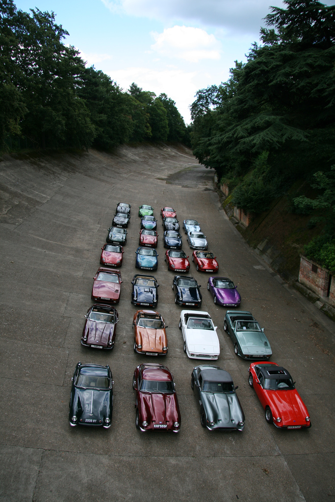 A collection of a majority of the production models TVR made in their history, taken at the famous Brooklands race circuit - the first purpose-built circuit in the world.