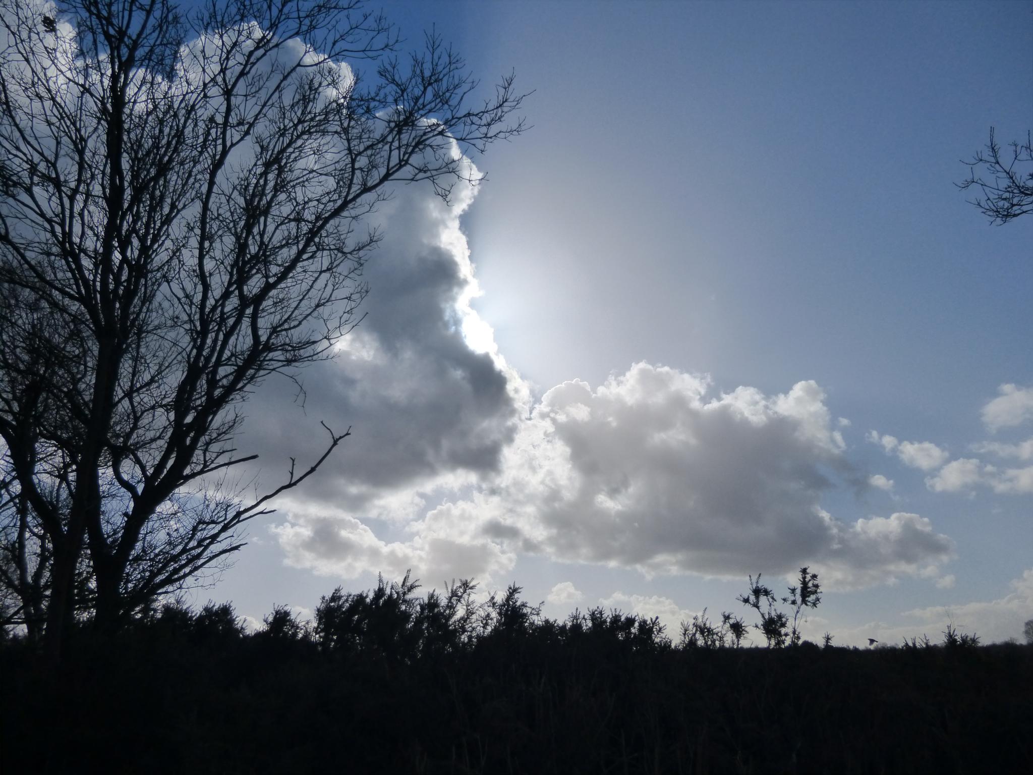 - clud, sun, sun behind clouds, tree, trees